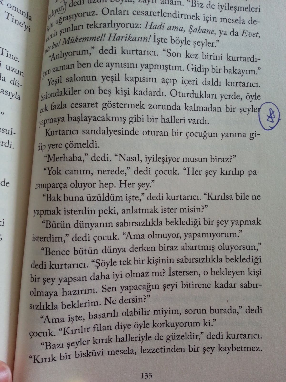 Yol boyunca karşılaştıkları insanlar, mekanlar bana yazarın Babam Çalılığa Dönüşünce kitabını anımsattı. Orada da Todd’un annesine ulaşana kadar yol boyu karşısına çıkan neşeli tipler vardı. Cik’te o kadar çok karakter yok ama kitabın özellikle son çeyreğinde ben epey eğlendim.Kitapta en sevdiğim bölüm Cik’le ilgili olmayan Rehabilitasyon Merkezi’ndeki bir çocuk ve kurtarıcı   arasında geçen bölüm. Anlatsam, anlatamam. Diyalogu kopyaladım: