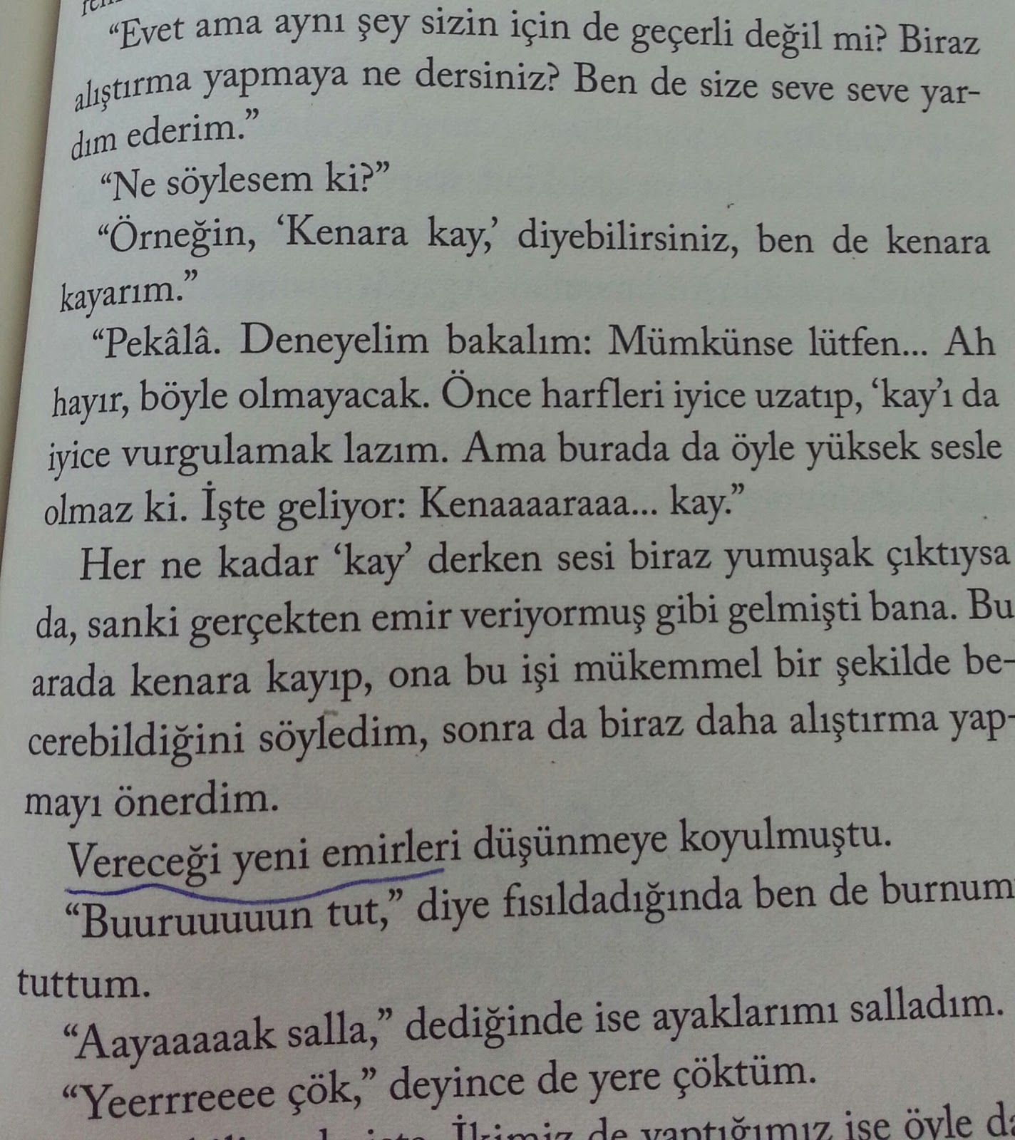 “Gelgelelim bilmediğim daha bir dünya şey vardı.Bir sınırın nasıl göründüğünü bilmiyordum örneğin. Bir hipopotamın kaç yaşına kadar yaşayabildiğini bilmiyordum. Tanıdığım hiç film yıldızı yoktu. Yarının nasıl bir gün olacağını bile bilmiyordum ki.”
