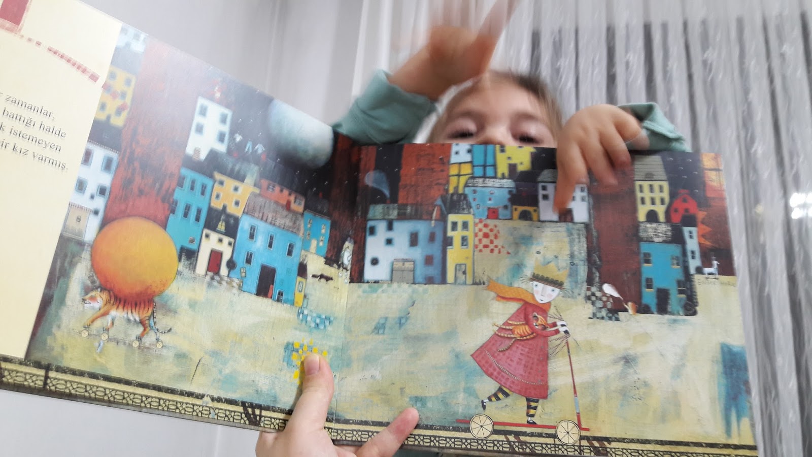 Gözlerimi “evet aynı sen” diyerek devirip okumaya devam ettim. Kitaptaki küçük kızın anne ve babasının yavrularını uyutmak gibi bir dertleri yok hatta bizim gibi öğrenilmiş çaresizlik bakışları, “yine uyumayacak” halleri hiç yok. “Uykum yok” diyen kızlarına gayet sakin bir şekilde uyumak zorunda olmadığını ama pijamasını giyip dişlerini fırçalaması gerektiğini söylüyorlar.