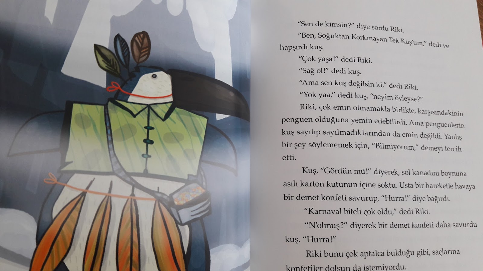 Hikaye böyle başlıyor ve daha en baştan ben o soğuk günlere gidip Riki ile beraber yola çıkmaya hazırlanıyorum. Malum, karda yürürken uyuyakalırsa birinin onu uyandırması gerek. Riki sıkılmış olabilir ama ben hala kartopu oynayabilecek gücü ve isteği kendimde buluyorum hatta onunla atkımı eldivenimi bile paylaşabilirim. Ama bu düşüncelerim çok uzun süremiyor çünkü buz gibi bir rüzgar eşlik ediyor yolculuğumuza. Önce burnum kızarıyor (hatta o ara aklıma “Burun Giysisi” hikayesi bile geldi 🙂 sonra gözlerim yaşarıyor ve bu kadar kısa sürede pes ettiğim için hayıflanmaya ve homurdanmaya başlıyorum.